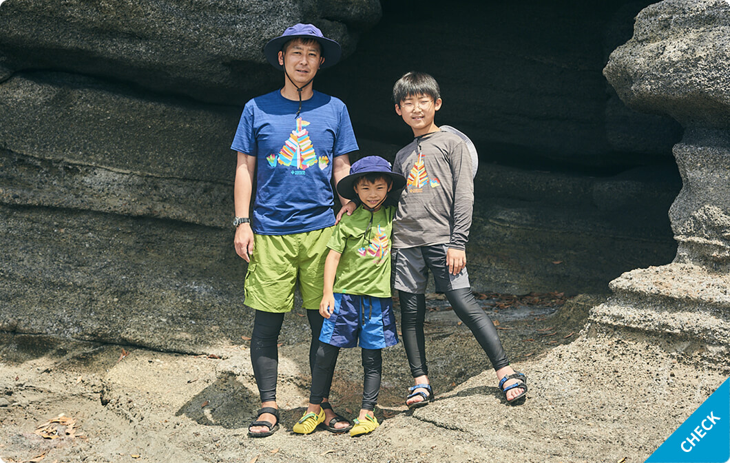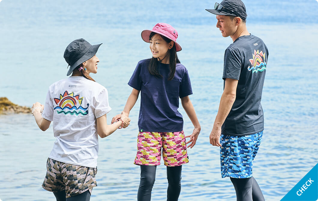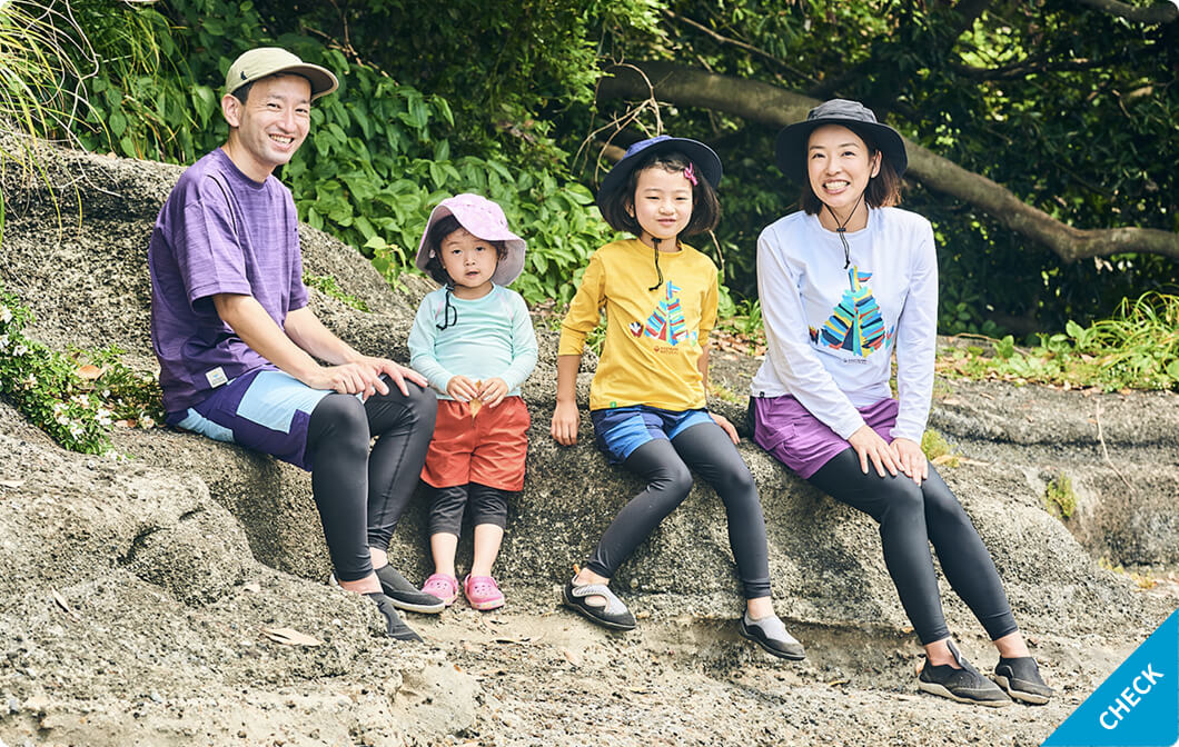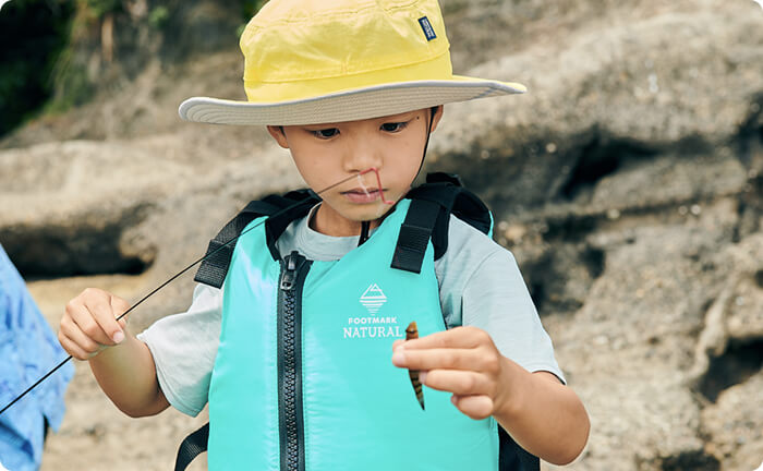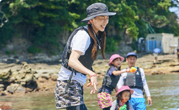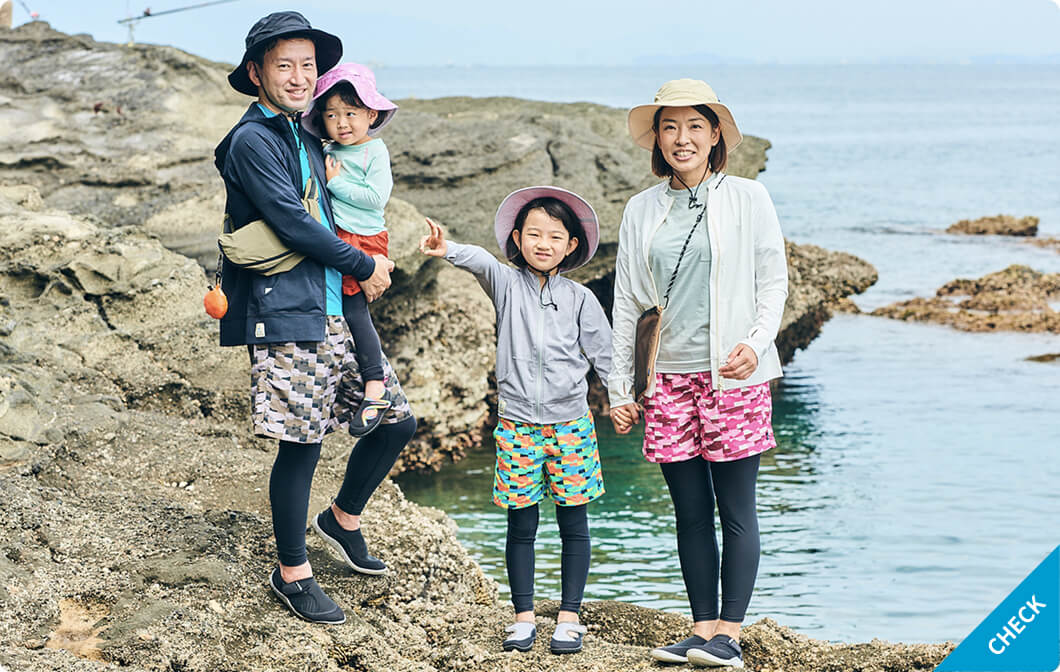 カラダ全部で水に触れて楽しむためには、安心安全なウエアを身に着けることが大切です。磯遊びにはライフジャケットはもちろん、足を保護するインナースパッツもマストアイテム!ショートパンツと組み合わせると最強です。
