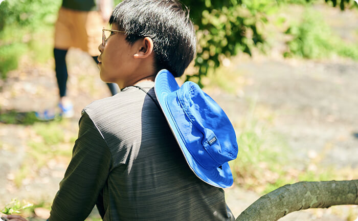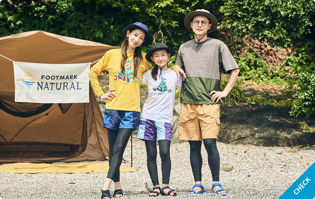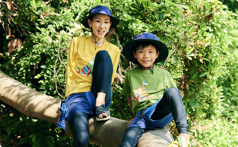 せっかく楽しく遊んでいても、ベタベタな服ではテンションダウン。すぐに乾く速乾性のウエアを選ぶことは大きなポイントです。オシャレなスパッツは足の保護にも。帽子は日よけだけでなく大事な頭部をまもります。もちろん水でっぽうや虫かごなど、遊び道具も忘れずに!