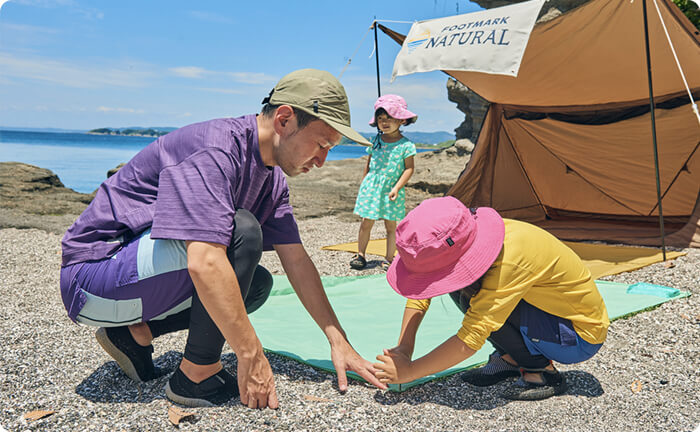 「パパ、私がやる!!」と、初めてのペグ打ち。簡単な作業から子どもと一緒にやって、子どもの好奇心を刺激して。シートは場所取りにも◎